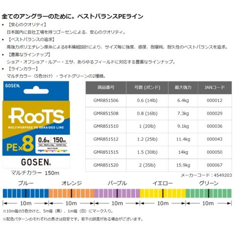 ゴーセン ルーツ PE×8 マルチカラー 150m(0.6号/14lb) GOSEN ROOTS PEライン GMR851506 【返品種別B】