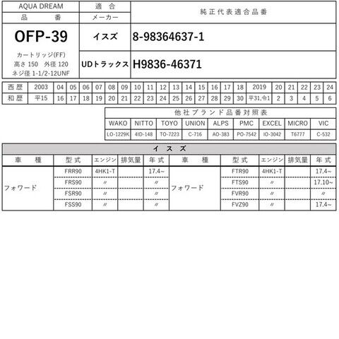 AQUA DREAM PLATINUM オイルフィルター イスズ・UDトラックス車用(代表純正番号:8-98364637-1等) アクアドリーム AD-OFP-39 【返品種別A】のレビュー