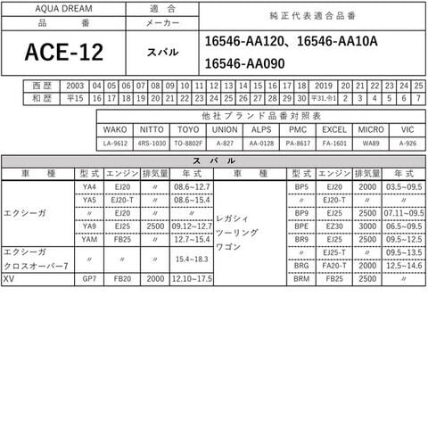 • 互換純正品番:【スバル】16546-AA120、16546-AA10A、16546-AA090