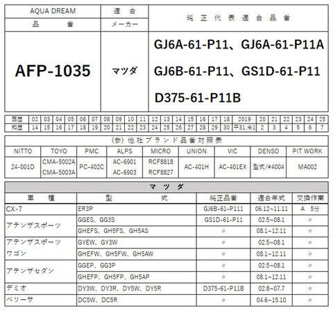 - 純正共通品番:「マツダ」GJ6A-61-P11、GJ6A-61-P11A、GJ6B-61-P11、GS1D-61-P11、D375-61-P11B