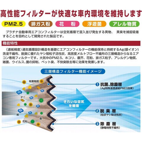 有効作用・・・ウイルス、菌、カビ安定風量(エアコンの風量を新車時にキープ)高精度ろ材を採用し、