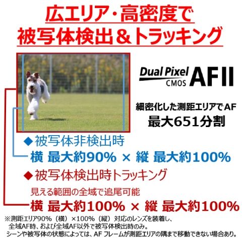 デュアルピクセルCMOS AF IIは、従来よりAFエリアが拡大・細分化したことにより、被写体をとらえて追いかける機能も進化しました。