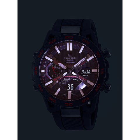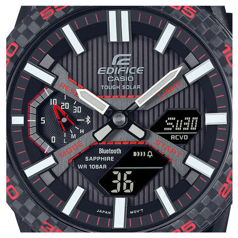 そしてメカニックのハードな使用を想定しEDIFICE初のカーボン強化樹脂ケースを採用。