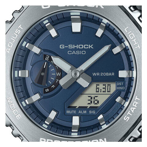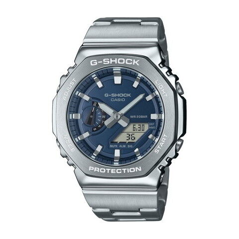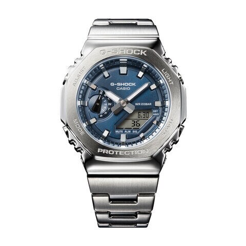 初代モデル“DW-5000C”のコンセプトを受け継いだデジタル・アナログコンビネーションモデルGA-2100のベゼルとバンドを金属素材にアップデートしたGM-2110Dです。