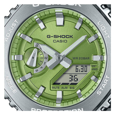 初代モデル“DW-5000C”のコンセプトを受け継いだデジタル・アナログコンビネーションモデルGA-2100のベゼルとバンドを金属素材にアップデートしたGM-2110Dです。