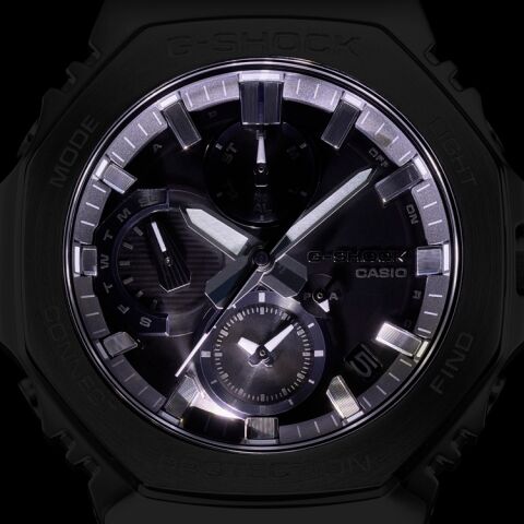 ケース、ベゼルにステンレススチールを採用しながら、1983年に誕生したDW-5000Cにも採用された八角形のベゼル形状を継承しています。ベゼルとケースの間に、ファインレジン製の緩衝材を実装することで、メタル外装による耐衝撃構造を可能にしています。