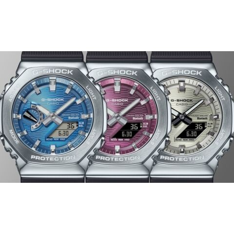 1983年の発売以来、飽くなき強さを求めて進化を続けるタフネスウオッチG-SHOCKから、2100シリーズの特徴であるスリムなサイズ感をキープしながら、スマートフォンリンクとタフソーラーを搭載したメタルベゼルのモデルです。ケース、バンドの主な樹脂パーツにはバイオマスプラスチックを採用し、環境にも配慮しました。