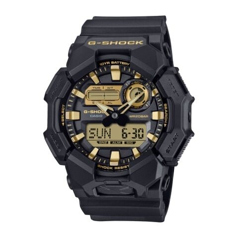 G-SHOCKらしい武骨なオールブラックのボディに、エネルギッシュに輝くゴールドをカラーリングしています。