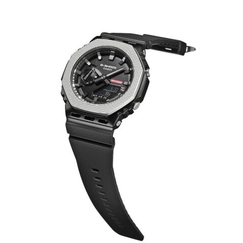 G-SHOCKの耐衝撃性を象徴するメタルの八角形ベゼルには、モダンインダストリアルデザインでも多く見られるチェッカリングパターンを施し、メタルベゼルや、機能表示をマーキングした赤いアクセントカラーが、機能性を豊かに表現しています。