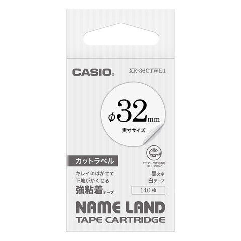カシオ カットラベル「キレイにはがせて下地が隠せる強粘着テープ」 [36mm幅/白テープ/黒文字/丸型φ32mm/140枚] CASIO NAME LAND(ネームランド) XR-36CTWE1 【返品種別A】