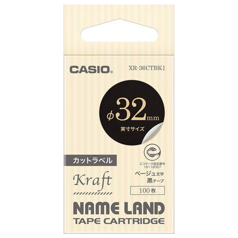 カシオ カットラベル「クラフトテープ」 [36mm幅/黒テープ/ベージュ文字/丸型φ32mm/100枚] CASIO NAME LAND(ネームランド) XR-36CTBK1 【返品種別A】