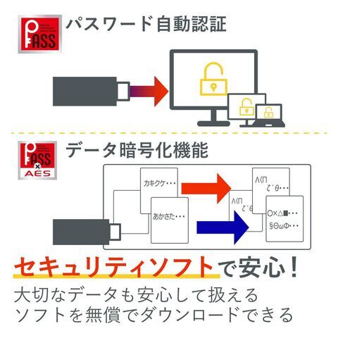 • セキュリティ機能:PASS(Password Authentication Security System) [パスワード自動認証機能付セキュリティソフト] or PASS(Password Authentication Security System) ×AES [パスワード自動認証機能付暗号化セキュリティソフト]