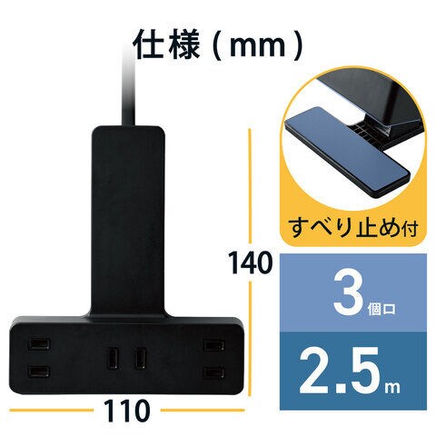 クリップ機構を搭載し、机などに挟んで利用することができる2ピン式の3個口タップです。