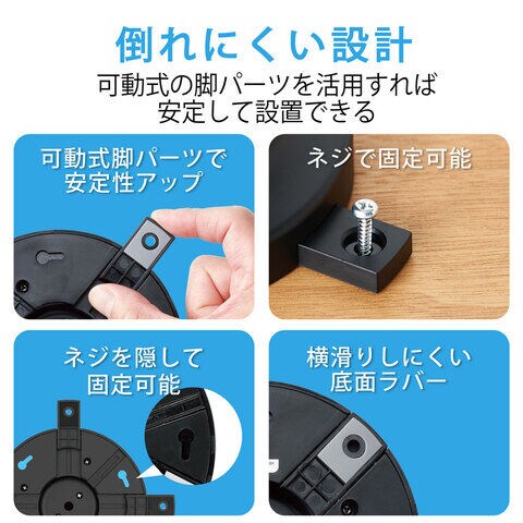 脚パーツには滑り止め部材を装備し、接続されたケーブルが引っ張られた際などにも、本体が横滑りしにくくなっています。