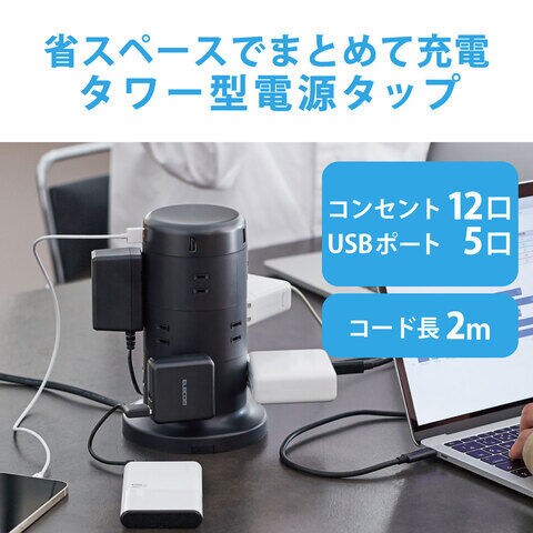 エレコム タワー型タップ(12個口+USB 5ポート・2m)ブラック ELECOM TT-U02-1220BK 【返品種別A】