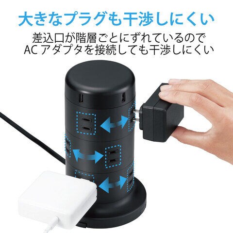 差込口は階層ごとに45度ずらした配置になっているため、ACアダプタなど大きなプラグを接続しても他の差込口に干渉しにくいです。