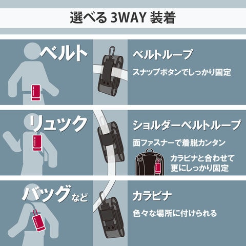 ◆ベルトループ、ショルダーベルトループ、カラビナフックを装備し、必要に応じて3つの装着方法を選べるマルチサイズ対応スマートフォン用キャリングポーチ。
