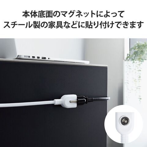 本体底面にマグネットを配し、差込口を使用していない時はスチール製の家具などに貼り付けておけます。
