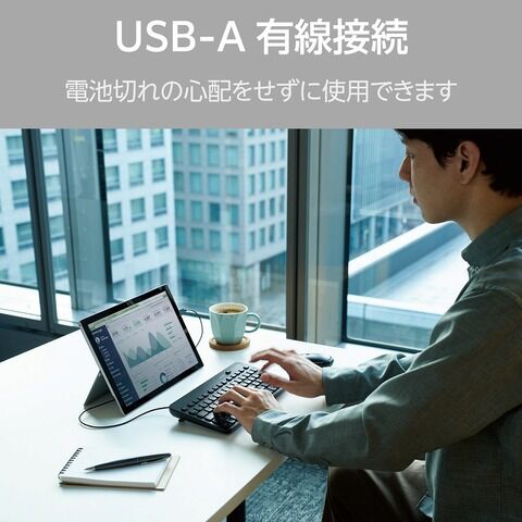 USBケーブルをパソコンにつなぐだけですぐに使用できる有線接続タイプです。パソコンからの給電で動作するため電池が不要で、電池切れの心配をせずに使用できます。 VCCI Class Bを取得した、電波障害が少ない設計です。