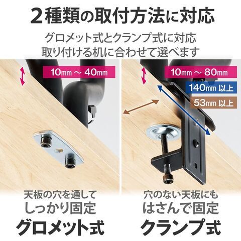 グロメット式とクランプ式の両対応なので取り付ける机に合わせて選べます。