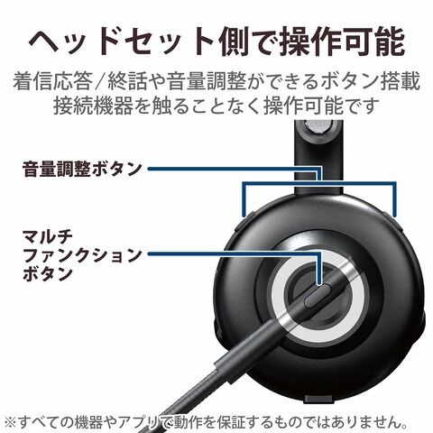 着信応答/終話やボリューム調整ができるボタン付きで、接続機器を触ることなく、ヘッドセット側で操作可能です。