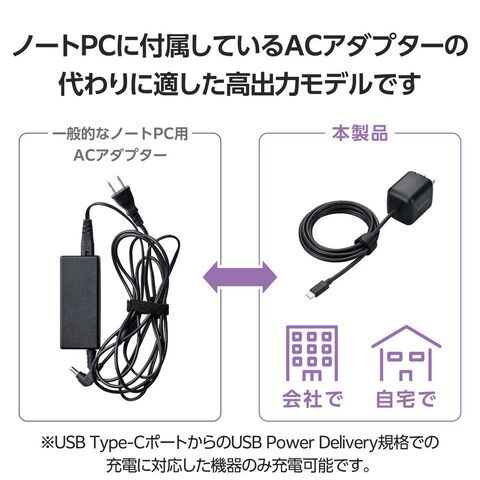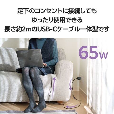 ◆USB Type-C(TM)ポート搭載機器の充電に便利! ケーブル一体型で、USB Type-Cポート搭載のノートパソコンからスマートフォンまで幅広い機器にすぐ充電できる、USB Power Delivery対応の高出力65W USB AC充電器です。コンパクトでビジネスでの外出やリモートワーク、出張、旅行など持ち運びにも便利です。