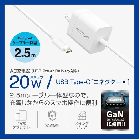 エレコム USB PD 20W AC充電器 Type-Cケーブル一体型 2.5m 折りたたみプラグ(ホワイト) PSE適合 MPA-ACCP7020WH 【返品種別A】