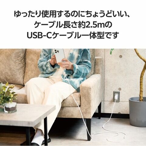 USB Type-Cポートを搭載する機器に挿すだけで充電できるケーブル一体型です。USB Type-Cプラグの一体型ケーブルは足下のコンセントに接続してもゆったり使用できる長さの約2.5mです。