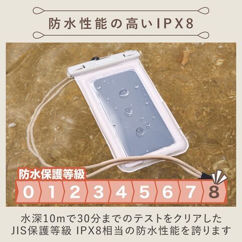 JIS保護等級IPX8相当の防水性能を実現する、水深約10mで30分までの防水テストをクリアしたフロート機能付きスマートフォン用防水ケースです。