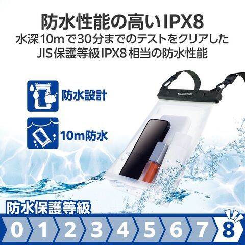 JIS保護等級IPX8相当の防水性能を実現する、水深約10mで30分までの防水テストをクリアした大容量タイプのスマートフォン用防水ケースです。