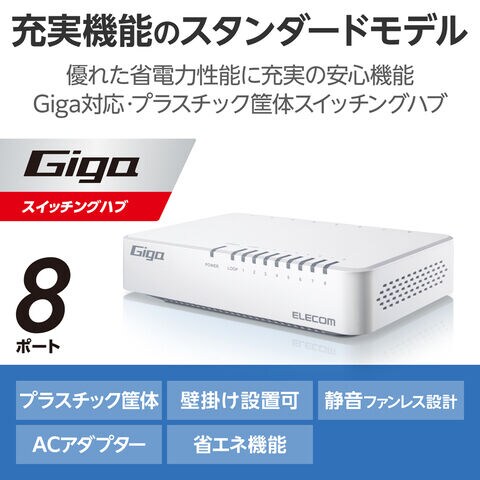 エレコム|ELECOM Giga対応 スイッチングハブ(プラスチック筐体/AC電源/ファンレス/静音/省エネ機能/壁掛け設置対応)8ポート(ホワイト) EHC-G08PA4-W 【返品種別A】