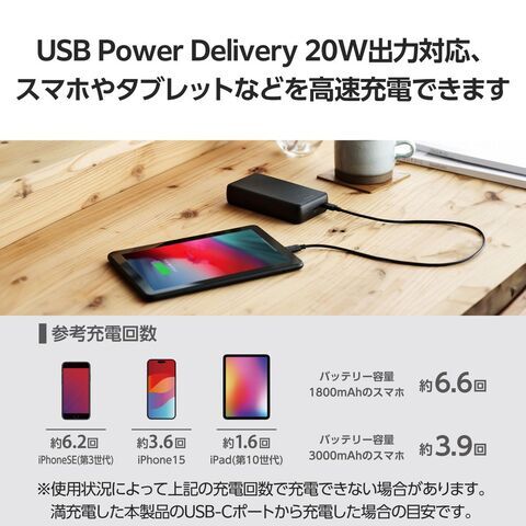 本製品(バッテリー容量20000mAh)で、1800mAhのスマートフォンを約6.6回、3000mAhのスマートフォンを約3.9回充電可能です。