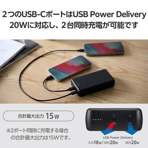 USB Power Delivery 20Wに対応した2つのUSB Type-Cポートを搭載。20000mAhの大容量モバイルバッテリーです。