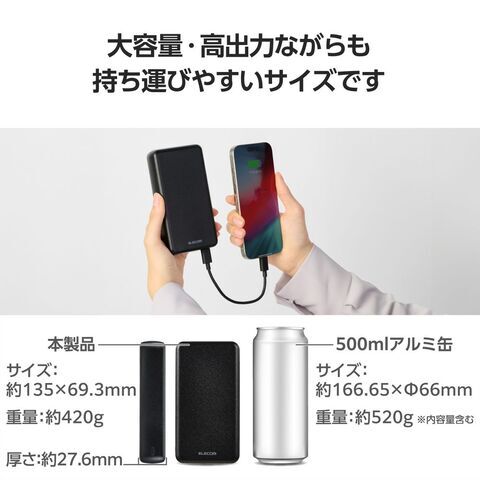 同じ出力・容量のモバイルバッテリーから体積を大幅にコンパクト化。