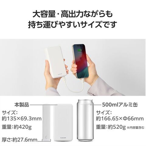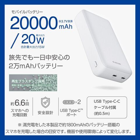 エレコム モバイルバッテリー 20000mAh 入出力(Type-C×1) 出力(Type-C×1) ケーブル付属(ホワイト) DE-C52-20000WH 【返品種別A】