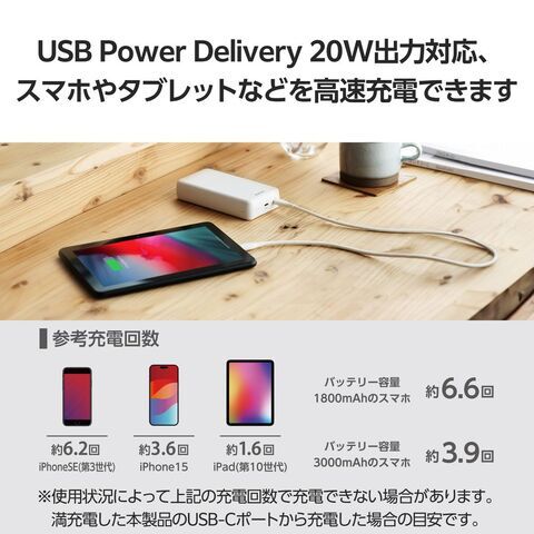 本製品(バッテリー容量20000mAh)で、1800mAhのスマートフォンを約6.6回、3000mAhのスマートフォンを約3.9回充電可能です。