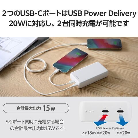 USB Power Delivery 20Wに対応した2つのUSB Type-Cポートを搭載。20000mAhの大容量モバイルバッテリーです。