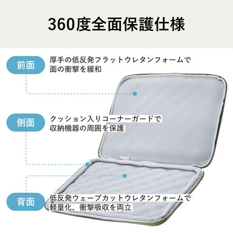 側面を360度保護するコーナーガードクッションと、天面、底面それぞれに内蔵された低反発ウレタンフォーム、機器表面を傷つけにくい内側の優しい起毛生地によって、ノートパソコンなど収納物を徹底的に保護します。