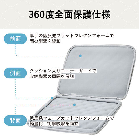 側面を360度保護するコーナーガードクッションと、天面、底面それぞれに内蔵された低反発ウレタンフォーム、機器表面を傷つけにくい内側の優しい起毛生地によって、ノートパソコンなど収納物を徹底的に保護します。