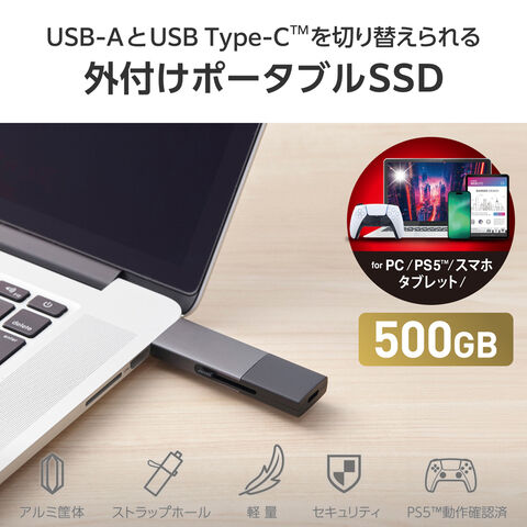 エレコム|ELECOM SSD 外付け 500GB USB3.2Gen2 スライド式 Type-C/USB-A 両対応 テレビ録画対応(ブラック) ESD-EWC0500GBK 【返品種別B】