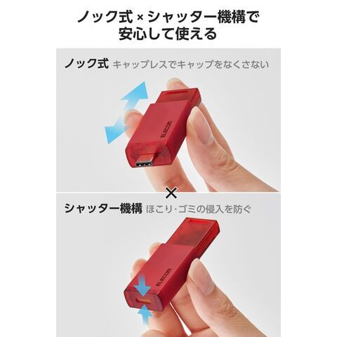◆ノック式×シャッター機構で安心して使える。キャップレスでキャップ紛失の心配がない、USB 10Gbps(USB3.2(Gen2))外付けポータブルSSDです。ノックで出して自動でコネクターを出し入れでき、未使用時はシャッターが閉じてコネクターの先端を保護。USB 10Gbpsの高速データ転送を実現します。
