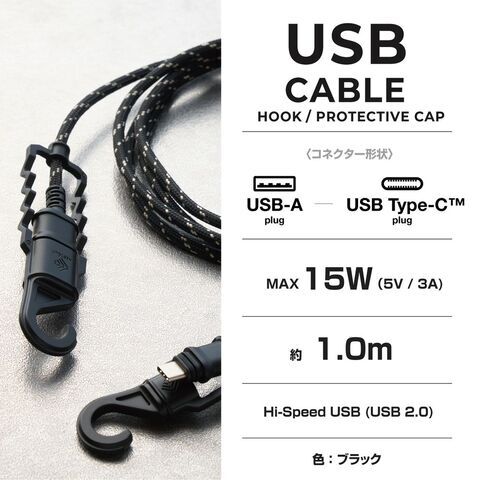 アウトドアギアになじむ、パラコードをイメージしたカラーリング。ケーブル長は、離れた場所からも充電しやすい1mです。