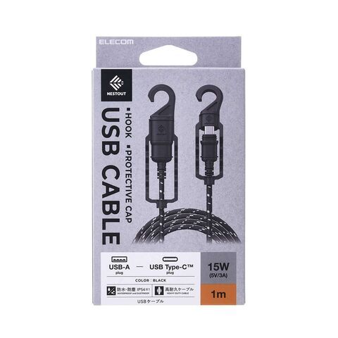 エレコム USB Type-C ケーブル < USB-A to USB-C > 1m 高耐久 先端保護 キャップ一体型フック付 IP54 防水/防塵 高速データ転送 充電ケーブル NESTOUT(ブラック) MPA-ACNE10BK 【返品種別A】
