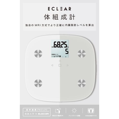 MRI測定により腹部全体の内臓脂肪を算出する体積推定法式を採用し、より正確な内臓脂肪レベルの評価が可能な”ECLEAR 体組成計”です。