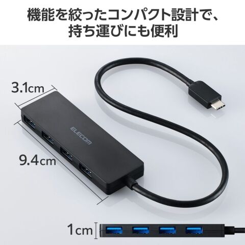 エレコム USB Type-C ハブ USB3.2 Gen1 USB-A ×4 バスパワー コンパクト 薄型【USB-C ポート搭載 MacBook mac Surface Windows iPhone iPad 等対応】ケーブル長30cm(ブラック) U3HC-H041BK 【返品種別A】