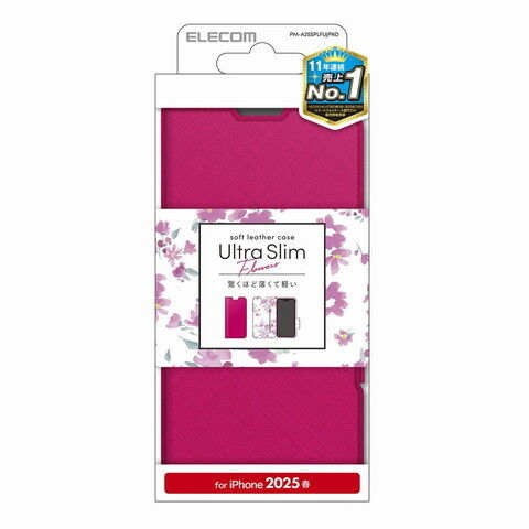 エレコム iPhone 16e用 ケース レザー カバー 手帳型 マグネット フラップ 衝撃吸収 超軽量 薄型 ストラップホール付 スタンド機能付 花柄 カードケース機能付 UltraSlim(ディープピンク) PM-A25SPLFUJPND 【返品種別A】