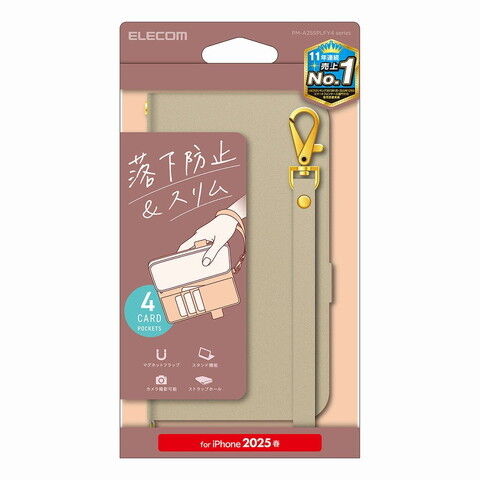 エレコム iPhone 16e用 ケース レザー カバー 手帳型 マグネット フラップ 衝撃吸収 ストラップホール付 ハンドストラップ付 スタンド機能付 カードケース機能付(グレージュ) PM-A25SPLFY4GB 【返品種別A】