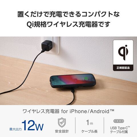 エレコム ワイヤレス充電器 Qi 認証 12W / 10W / 7.5W / 5W 卓上 充電器 ケーブル付属 1m 置くだけ充電 薄型 コンパクト 【 iPhone AirPods Android Pixel Xperia Galaxy 等対応 】(ブラック) W-QA28BK 【返品種別A】