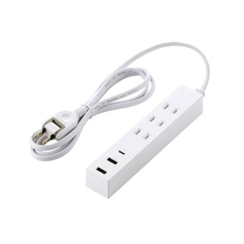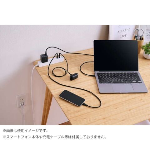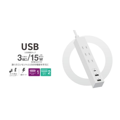 ACタップとUSBポートが一体になった、スマートフォンやワイヤレスイヤホンなどを充電できるコード付きUSBタップです。