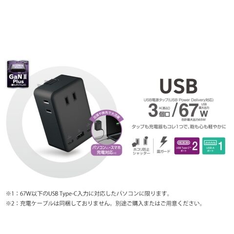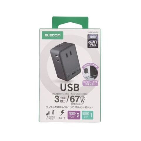 エレコム コンセント直挿しUSBタップ(3個口/USBポート A×1、Type-C×2) ブラック ELECOM T-U09-3AC2BK 【返品種別A】